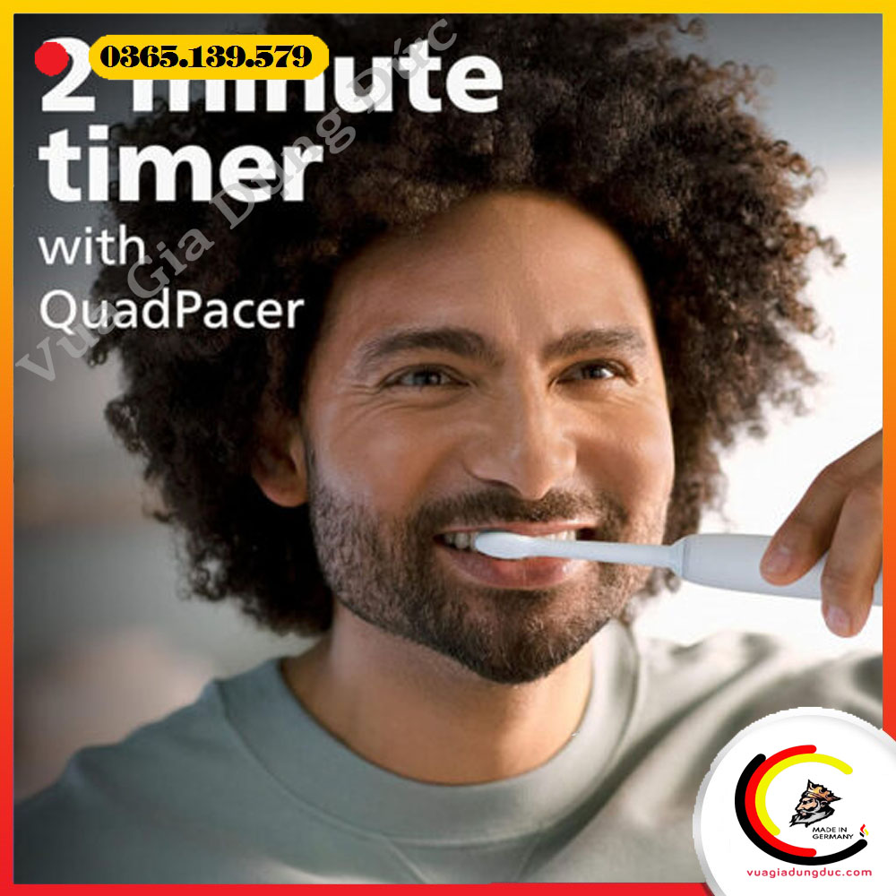 Bàn chải được tích hợp bộ hẹn giờ thông minh 2 phút – khoảng thời gian chải răng tiêu chuẩn do nha sĩ khuyến nghị. Chức năng QuadPacer sẽ tự động nhắc nhở người dùng chuyển vùng chải sau mỗi 30 giây, giúp làm sạch đều 4 góc phần tư của khoang miệng. Nhờ đó, răng được làm sạch toàn diện mà không bỏ sót bất kỳ khu vực nào.