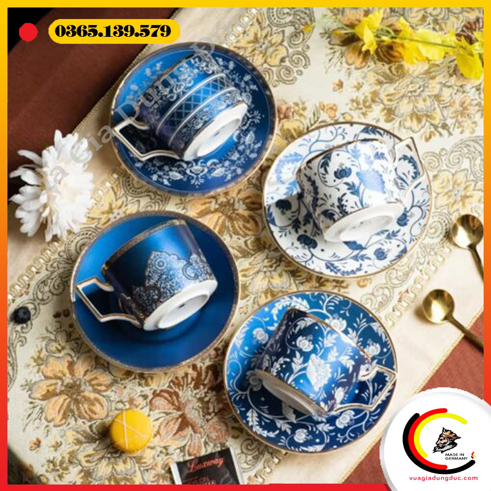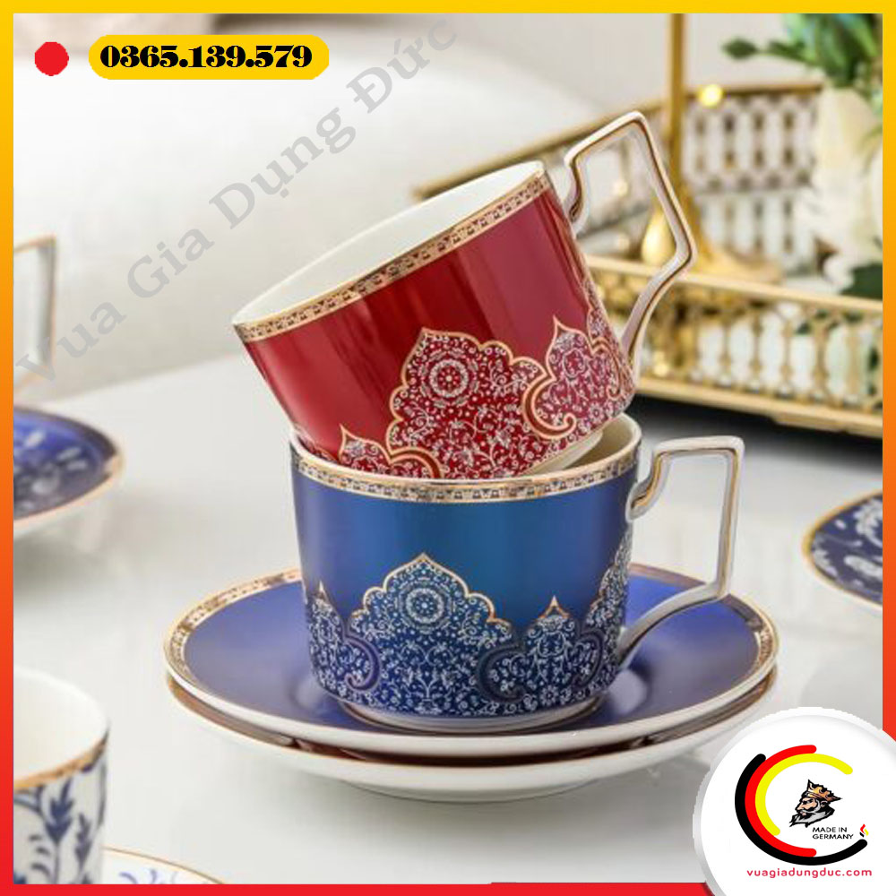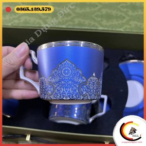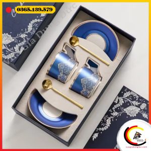- Trọn bộ gồm: 2 tách + 2 đĩa + 2 thìa vàng sang trọng.