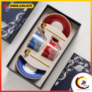 - Trọn bộ gồm: 2 tách + 2 đĩa + 2 thìa vàng sang trọng.