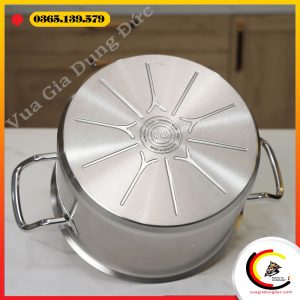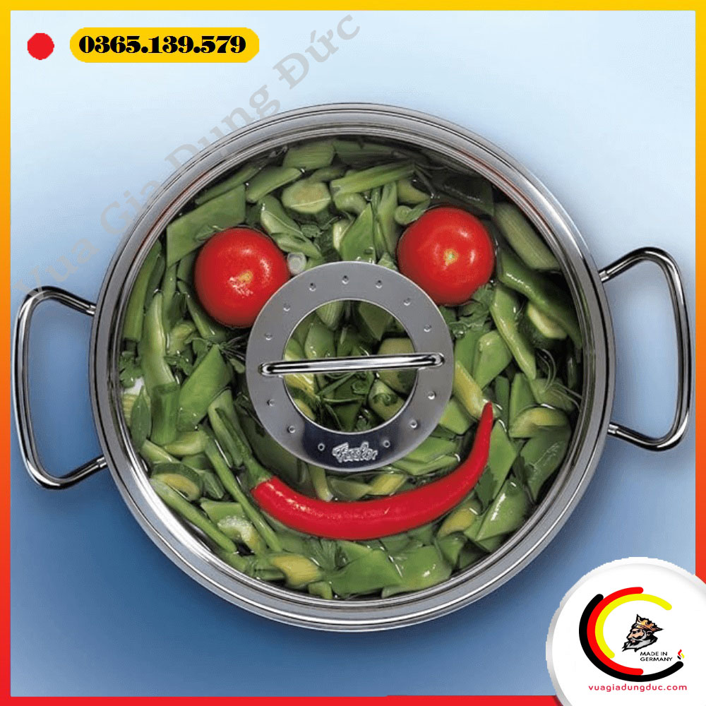 - Thiết kế vòm ngưng tụ (ở phiên bản vung thép): Phần giữa của nắp vung được thiết kế hơi vòm xuống. Khi hơi nước bốc lên, sẽ ngưng tụ tại điểm này và nhỏ giọt trở lại xuống nồi. Chức năng này giúp giữ lại tối đa vitamin, khoáng chất và làm cho món ăn trở nên thơm ngon, đậm vị hơn.