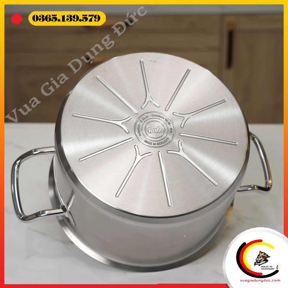 Khả năng chịu lực phi thường: Thiết kế này mang lại khả năng chịu lực ấn tượng lên đến 150kg. Fissler tự tin chứng minh rằng một người trưởng thành có thể đứng lên hai tay cầm mà không gặp bất kỳ vấn đề gì. Điều này đảm bảo bạn có thể hoàn toàn yên tâm khi nhấc nồi chứa đầy thức ăn nặng.