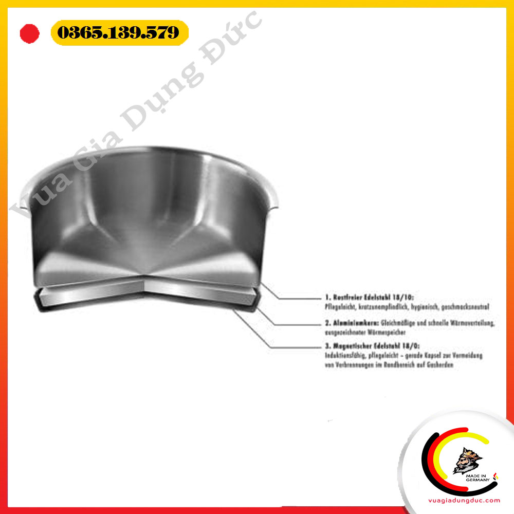 – Bộ nồi inox 304 của Đức này được làm hoàn toàn từ thép không ghỉ 18/10 dày dặn, chắc chắn, bền đẹp sáng bóng với thời gian, trơ về mặt hoá học nên cực kỳ an toàn cho sức khoẻ, dễ dàng làm sạch.