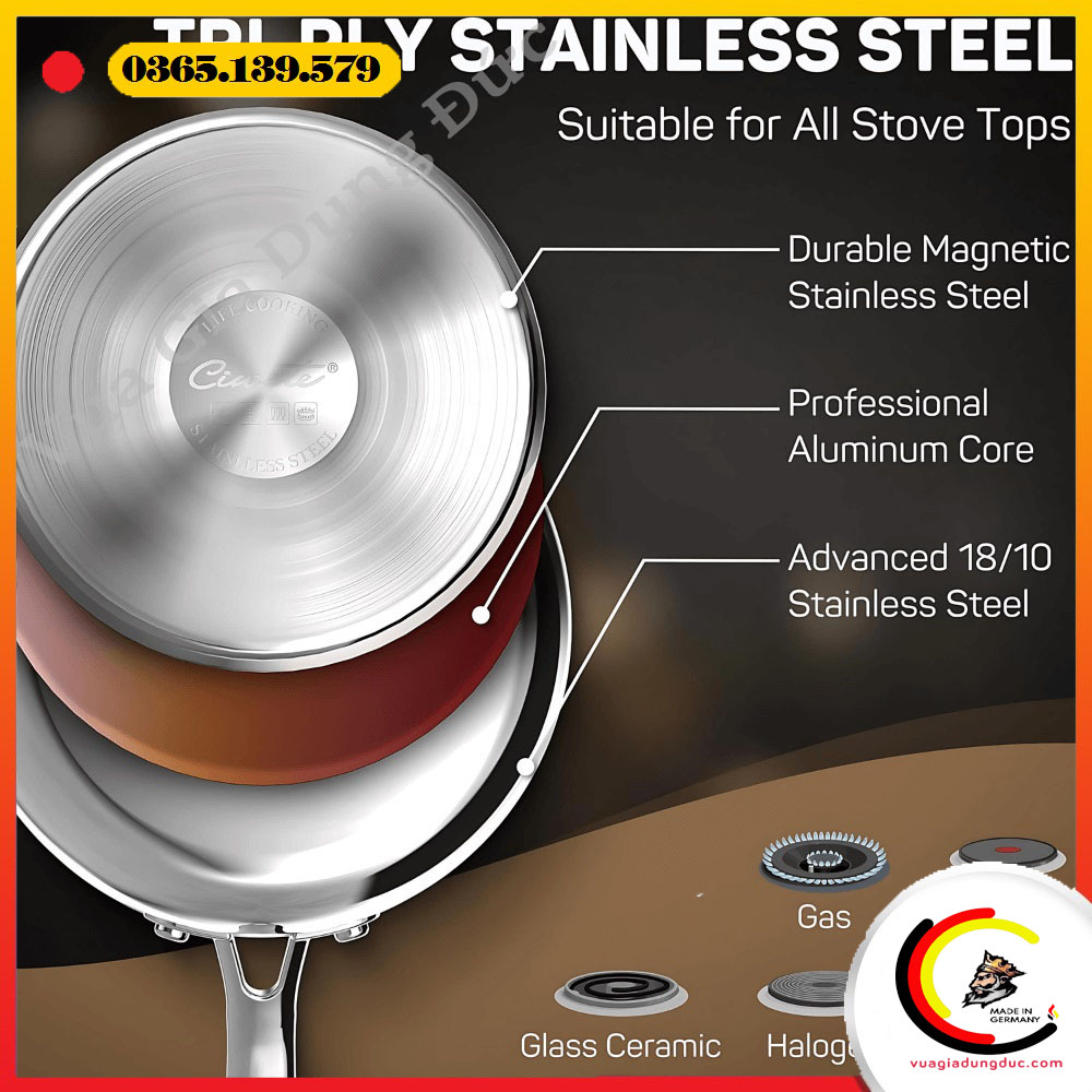 • Gia nhiệt nhanh, đều nhờ công nghệ đáy TRI-PLY 3 lớp – tiết kiệm thời gian và nhiên liệu