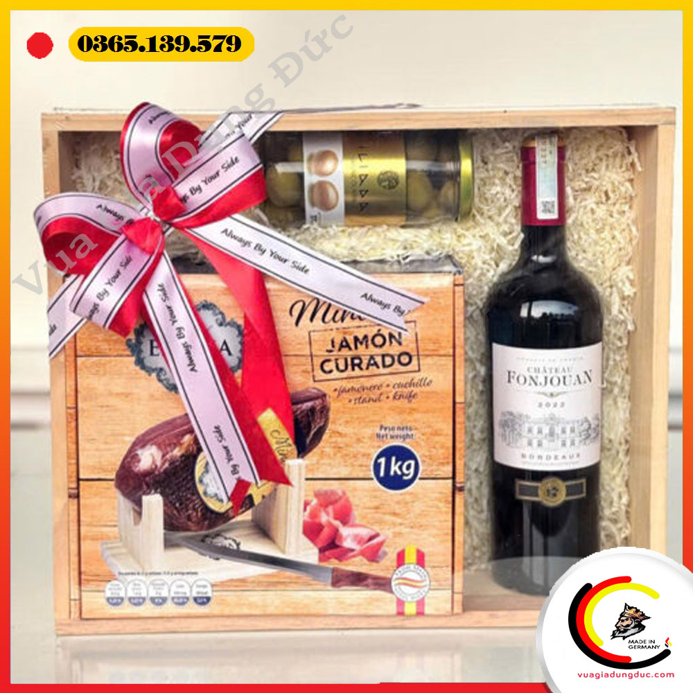 Kết hợp cùng rượu vang đỏ Bordeaux và ô liu xanh cao cấp, set quà mang đến trải nghiệm thưởng thức chuẩn Âu, hài hòa và tinh tế.